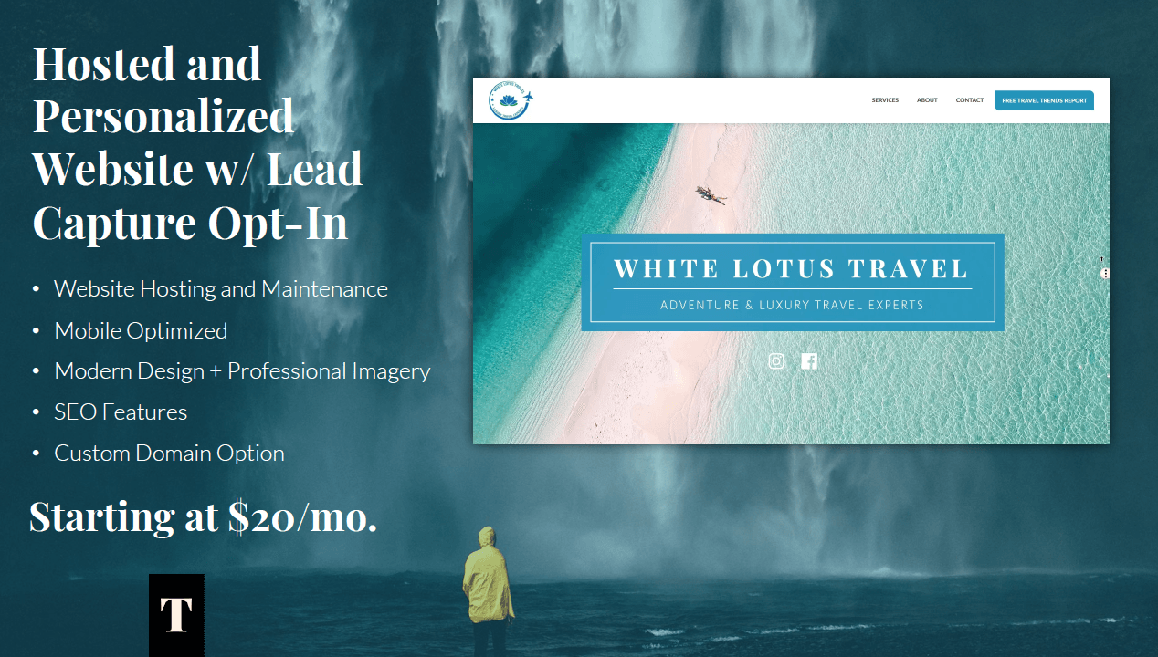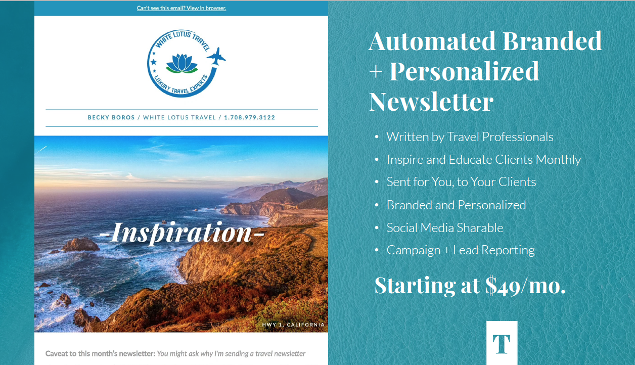 The concept came after observing how travel advisors – always busy with clients – had no time to market themselves. Primary services include custom website plus newsletter creation and delivery – directly to travel advisors’ individual databases.